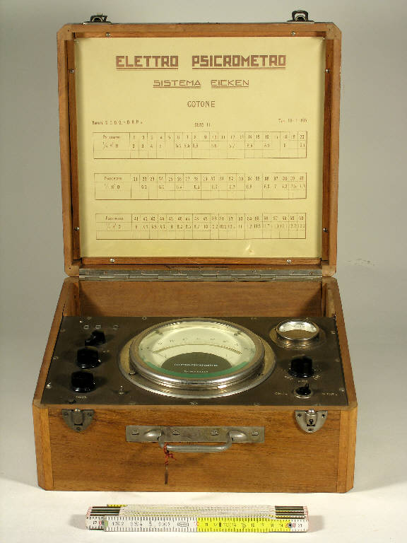 Lo strumento è fissato entro una cassetta di legno con coperchio incernierato e chiusura con serratura a chiave. Aprendo il coperchio sono visibili un vano per l'alloggiamento della sonda e il frontale dello strumento con le scale di lettura e i comandi. Su un foglio che fodera l'interno del coperchio è riportata la scala di conversione per la lettura dei dati rilevati: sopra c'è la scala dello strumento ("psicrometro") da 1 a 60, sotto la scala per la lettura del valore corrispondente di umidità ("% H2O"). L'intestazione è: "Elettropsicrometro - Sistema Eicken - Cotone - Breveté - Type 10-10-105". Etichetta metallica sul coperchio: "Made in france". Etichetta metallica sul coperchio "S.A.P. Societé d'Appareils de Précision - Lyon - N° 3512".