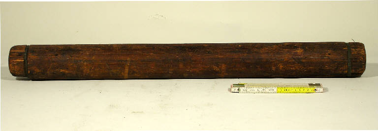 Cilindro in legno, con canale centrale. Vicino alle estremità due cinture metalliche di rinforzo