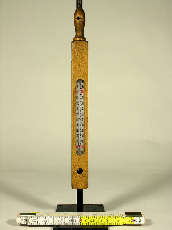 Il termometro, ad alcool, è racchiuso e protetto entro una custodia in legno con fenestratura anteriore per la lettura del valore di temperatura e con un breve manico con anello e laccetto.