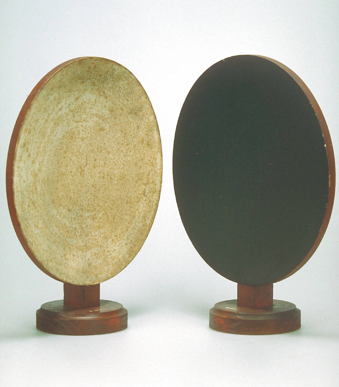 Si tratta di due calotte paraboliche di legno, verniciate internamente una in bianco e l'altra in nero. Entrambe si trovano su un supporto di legno.