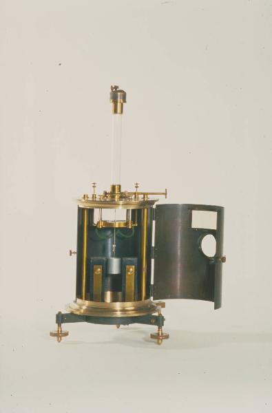 Una scatola cilindrica di ottone brunito è sostenuta da tre gambe munite di viti calanti. La scatola ha una finestra circolare di vetro in corrispondenza dello specchio dell'equipaggio mobile e quattro finestrelle rettangolari in corrispondenza dei settori. Sotto il coperchio della scatola sono sospesi a colonnine di vetro quattro quadranti di ottone formanti una scatola piatta cilindrica. Uno di essi è mobile. I settori sono collegati a coppie ed ogni coppia è in comunicazione con un elettrodo munito di serrafili sospeso all'interno della scatola con una colonnina di vetro. Un terzo elettrodo analogo reca un filo di platino che pesca in una vaschetta di piombo posta sul fondo della scatola. Sul coperchio della scatola si trova un tubo verticale sulla sommità del quale, ad un piccolo arganetto, sono fissati i capi della sospensione bifilare che sostiene l'equipaggio mobile. Una manopola con vite senza fine che ingrana nella filettatura alla base della colonna permette di ruotare la colonna stessa e la sospensione. Due lamine metalliche scorrevoli con scanalatura, inserite sotto l'arganetto, possono regolare la posizione dei fili. L'equipaggio mobile è formato da un filo d'alluminio a fora di 8 inserito fra i quadranti. Esso è munito di uno specchietto per le letture a riflessione e di un filo metallico che inferiormente pesca nella vaschetta di piombo. Un serrafili è fissato alla scatola e permette di collegarla alla terra.