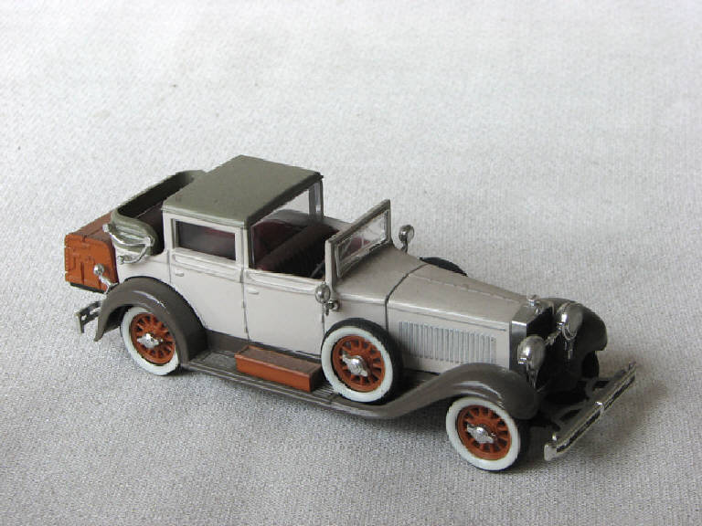 Modellino di automobile Isotta Fraschini tipo 8A "landaulet imperiale" in scala 1:43. Poggia in un contenitore in plastica trasparente nel quale è presente anche un foglietto illustrativo con la storia del modello di automobile.