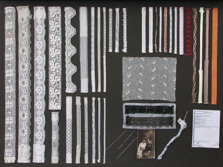 Bacheca in legno e vetro contenente 19 pizzi bianchi con diverso motivo, 2 neri, 13 passamanerie di diverso colore e dimensione.\nNella bacheca si trovano anche quattro aghi, una matassina di filo e una foto che ritrae la mamma della donatrice, che ha realizzato il materiale esposto.