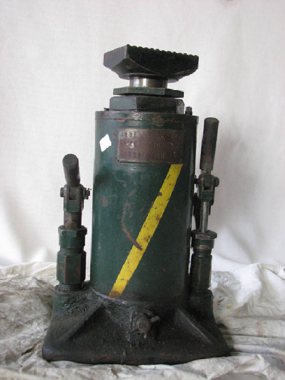 basamento in ferro a forma quadrata su cui è montato un cilindro. Dalla faccia superiore fuoriesce un albero d'acciaio pieno con in cima una base d'appoggio zigrinata.Sul basamento\n n° 2 maniglie simmetriche rispetto al cilindro che azionano dei pistoni di pompaggio. Sono incernierate ad un alberino oscillante parallelo al pistoneSotto l'albero all'interno del cilindro c'è dell'olio.Un rubinetto inferiore permette di abbassare l'albero riducendo la pressione .