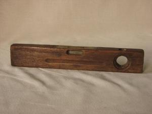parallelepipedo in legno con superfici perfettamente liscie.Sulla faccia superiore finestrella rettangolare in vetro con cornice in ottone e bolla di liquido all'interno.Sulle facce anteriore e posteriore finestrella circolare senza vetro