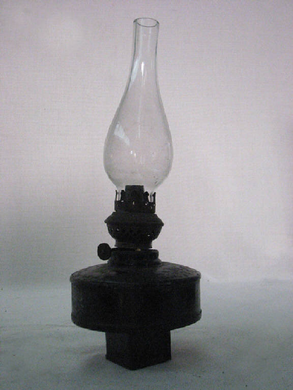 serbatoio cilindrico in lamiera verniciata nera poggiato su piccolo piedistallo a forma di cubo.Sopra un bulbo panciuto e forato che contiene lo stoppino proveniente dal serbatoio e che arriva al portastoppino che ha una aureola ricamata che funge da sede del tubo di vetro soprastante.Alla base del portastoppino un pomello girevole permette allo stoppino di salire man mano che si consuma.\nLo stoppino è in canapa ( o cotone ) intrecciata