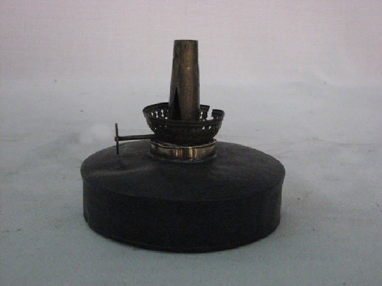 base formata da un serbatoio a forma cilindrica sopra la quale ,al centro,era montato un portastoppino con una basetta a tazza rotonda con la parete traforata ed un beccuccio che fuoriesce dal centro.\nAlla base del portastoppino un pomellino a ruota per la regolazione dell'altezza dello stoppino.All'interno uno stoppino di canapa o cotone a fili intrecciati