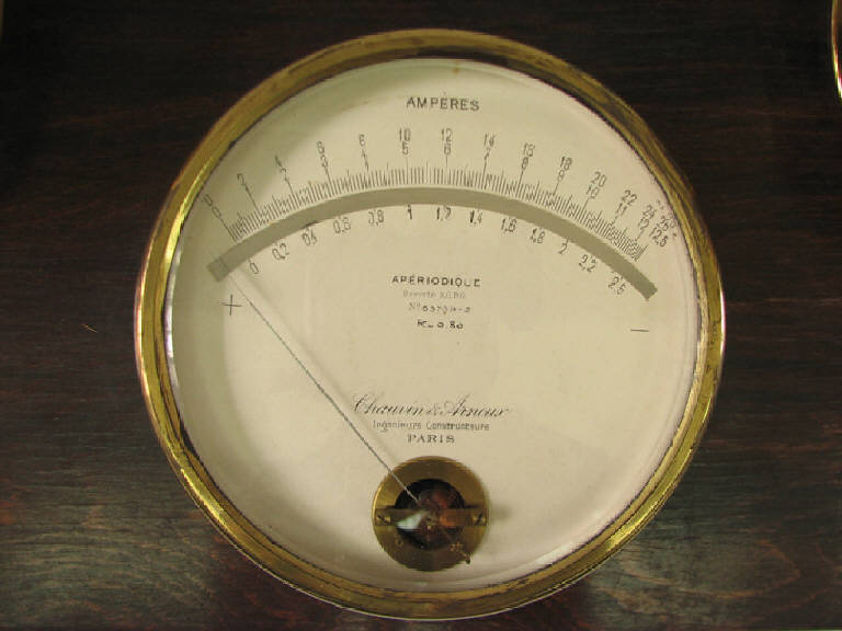 corpo cilindrico con quadrante tondo sotto vetro.La scritta "amperes" sulla parte superiore del quadrante.Immediatamente sotto ad andamento curvilineo parallelo al contorno ,su un'unica rappresentazione ,n° 3 scale graduate .Sopra la scala da 0 a 12,5 ,sopra di questa la scala da 0 a 25; sotto la scala da 0 a 2,5 ; quindi scendendo su righe diverse le seguenti iscrizioni:Aperiodique;Brevetè S.G.D.G.; n° 53734-2; R 0,9;la ragione sociale;\nPiù in basso il cerchio disegnato con al centro l'asse di rotazione dell'ago indicatore.Ai due lati i morsetti a vite per il collegamento elettrico.\nShunt separato costituito da una placchetta rettangolare di ottone con due viti superiori per l'inserimento dei cavi del circuito ed avente le seguenti caratteristiche :n° matr. 24250; 2,5 amperes ;16000 microhms