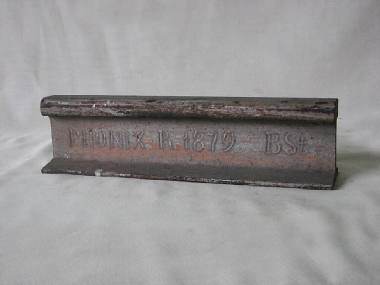 trafilato in acciaio a forma di fungo con basamento di appoggio.La campionatura visibile dalle allegate immagini presenta una campionatura di rotaie per età ( a partire dal 1880) e per peso per metro lineare; è anche presentata un'immagine di accoppiamento ruota rotaia