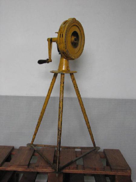 appoggio a tre gambe tubolari collegate alla base con tre astine orizzontali di rinforzo e di stabilità.Sopra è montata una ciambella in lamiera con fessure lungo la circonferenza ed al cui interno è montata una ventola girevole mediante una manovella esterna.