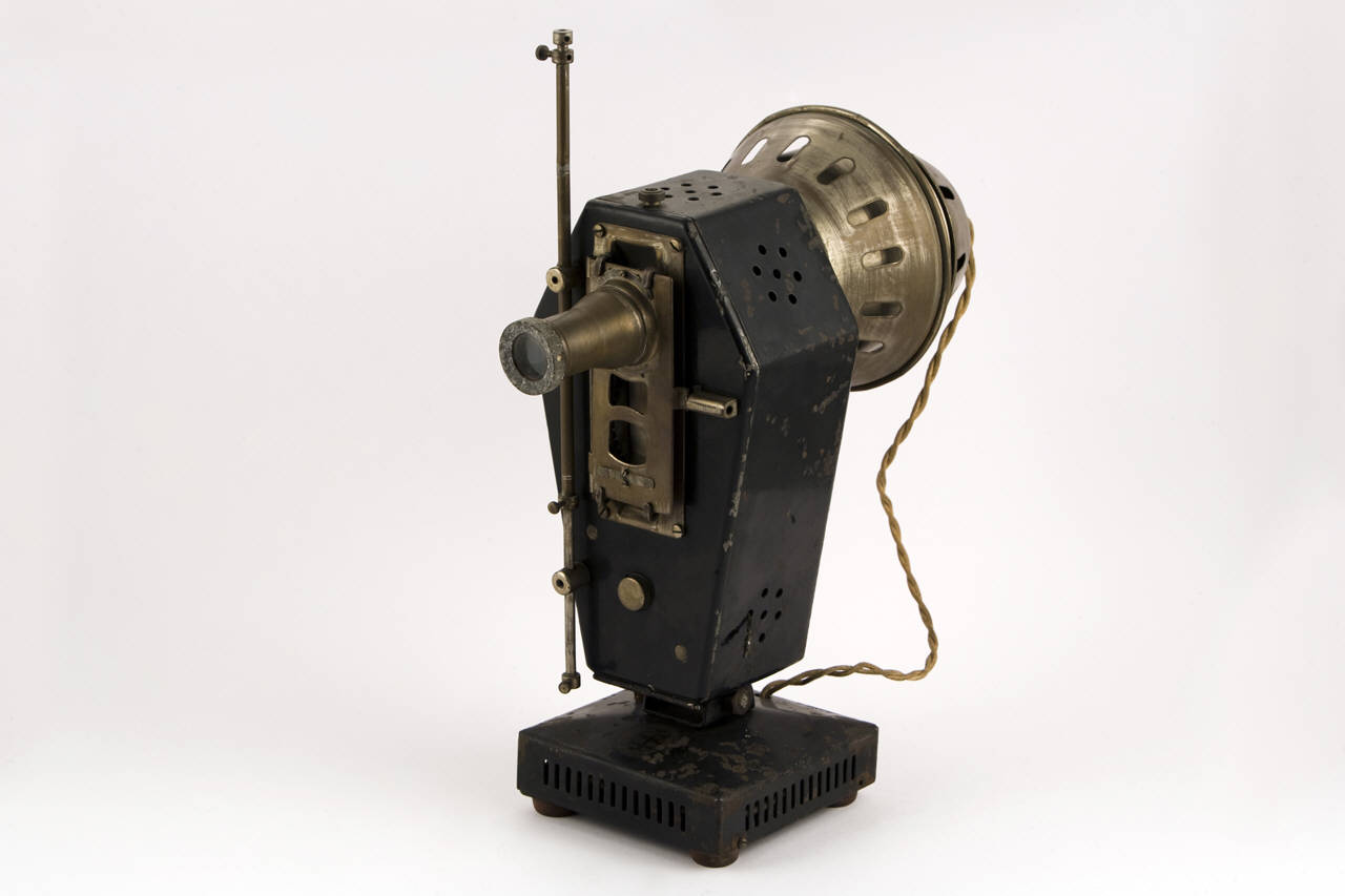 Proiettore cinematografico da tavolo in metallo a sviluppo verticale. Costituito da due parti: una lanterna elettrica e l'apparato di proiezione. L'apparato di proiezione, in metallo a forma esagonale, poggia su una base quadrata in metallo e la lanterna è fissata sulla parte posteriore.\nLa lanterna è costituita da un porta lampada con lampadina ad incandescenza e collegato mediante un cavo elettrico alla base, inserito in un cilindro con fessure per l'aerazione che si inserisce ad incastro in un altro cilindro analogo fissato al proiettore. Nel punto di contatto si ha una lente condensatrice.\nSulla faccia frontale del dispositivo di proiezione, all'altezza della lente condensatrice è fissata una guida in metallo dove scorre la pellicola da 35mm, trascinata dai dentini collocati su due ruote, ed è presente una fessura quadrata delle dimensioni del fotogramma che viene proiettato.\nDavanti alla fessura, su una placca in metallo incernierata lateralmente ed apribile, è inserito l'obiettivo.\nNella base si hanno i connettori elettrici per le diverse tensioni di alimentazione (110V-220V) e nel corpo del proiettore il motorino elettrico e dispositivi di trasmissione del moto.