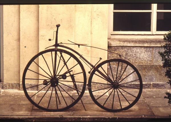 Biciclo del tipo Michaux con telaio prolungato sulla ruota anteriore, forcella e manubrio in ferro forgiato. Due predelline parallele sono poste frontalmente alla ruota posteriore per consentire la salita in sella e il riposo delle gambe durante la guida a ruota libera. Il biciclo monta una sella imbottita rivestita di cuoio, sospesa elasticamente su una balestra in lamina metallica, sorretta da due barre in metallo inserite nella parte posteriore del telaio. Il manubrio dritto presenta manopole in legno tornito. Il biciclo dispone di un freno a pattino sulla ruota posteriore, comandato dalla rotazione della manopola del manubrio azionante a funicella una lunga leva e provvisto di molla di ritorno a cilindro. Il funzionamento si basa su due pedali registrabili in metallo, applicati all'asse della ruota anteriore. Il veicolo poggia su due ruote con cerchio in legno con cerchioni a gola in metallo per gomme piene in caucciù; la ruota anteriore presenta 18 razze in legno, mentre la ruota posteriore ne conta 16. Il biciclo infine è provvisto di portalume anteriore e di stampella sul lato sinistro per il sostegno del mezzo durante la sosta.