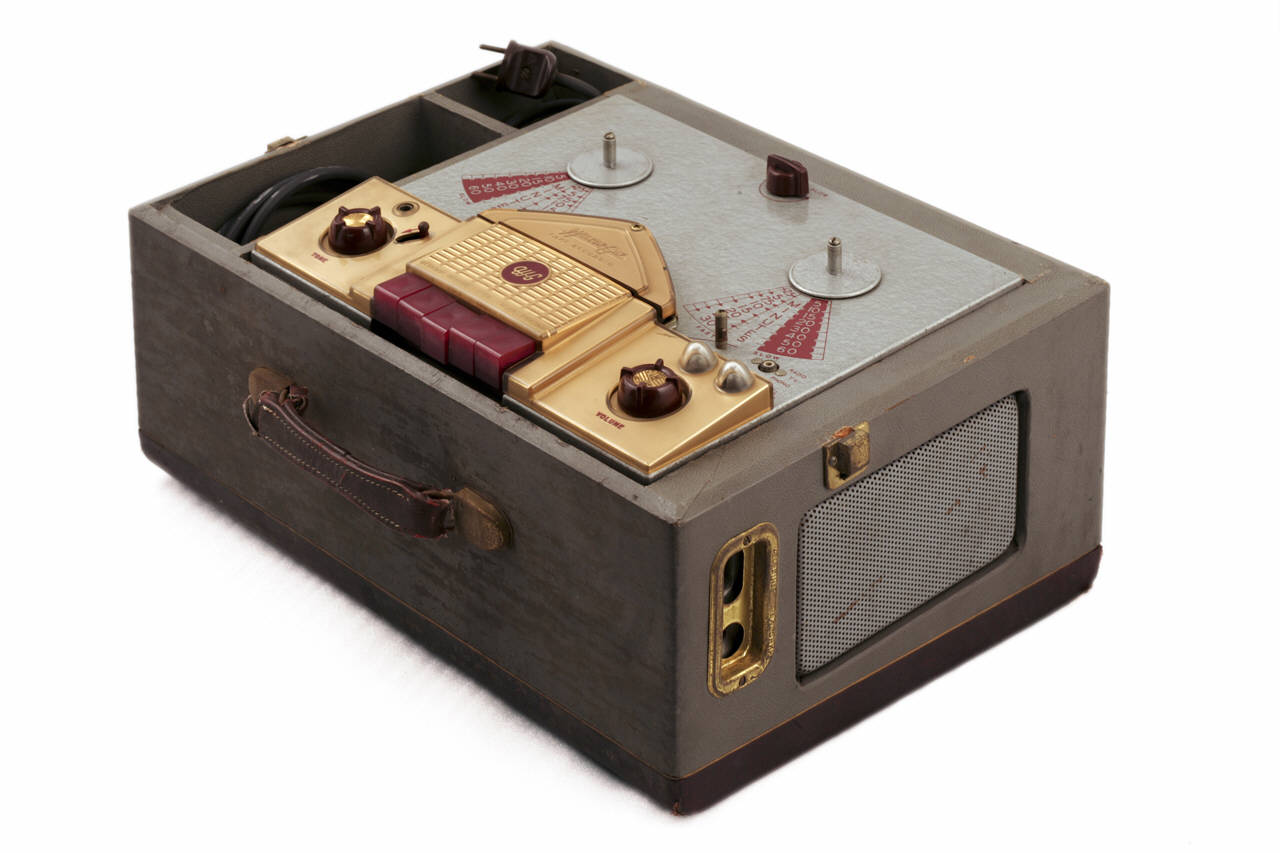 Magnetofono collocato in una scatola in legno, rivestita da tela di colore grigio nella fascia centrale e di colore bordeau sul fondo e sul coperchio; sul lato anteriore, presenta una maniglia in pelle. All'interno della scatola sono situati il motore elettrico e i circuiti. Il coperchio asportabile ricopre il piano di lavoro dell'apparecchio e due scomparti per la sistemazione dei cavi elettrici. Il piano è costituto da una superificie in metallo sulla quale è applicata, nella parte anteriore, una banda in plastica gialla trasparente dovo sono posizionati i comandi. I comandi sono costituiti da due selettori bordeau per i livelli del volume e del tono e da cinque pulsanti in plastica bordeau per il riavvolgimento, l'avvio della registrazione, l'arresto, l'avvio della riproduzione e l'avanzamento veloce del nastro; due spie luminose, poste al di sopra del selettore del volume, mostrano il livello di registrazione del nastro. Le dotazioni dell'apparecchio prevedono inoltre una boccola per il collegamento del microfono posta al di sopra della manopola del tono e una boccola per la connessione con altri dispositivi (radio, televisione e telefono). Oltre ai comandi, sul piano si trovano due fusi per la sistemazione delle bobine del nastro, nella cui sede è segnata una scala graduata per l'indicazione dei minuti di registrazione. Nella parte alta del piano, al centro tra le due bobine è posto il commutatore per la selezione della velocità di movimento del nastro. Sul fianco destro dell'apparecchio sono situate una presa bipolare per l'alimentazione e una boccola per il collegamento in uscita ad amplificatori esterni, mentre sul lato posteriore si trova lo spinotto per la selezione della tensione di alimentazione. Sul fianco destro, sul lato posteriore e sul fondo sono inserite delle lamine traforate. Il magnetofono è accessoriato con due cavi elettrici conservati negli scomparti della base.