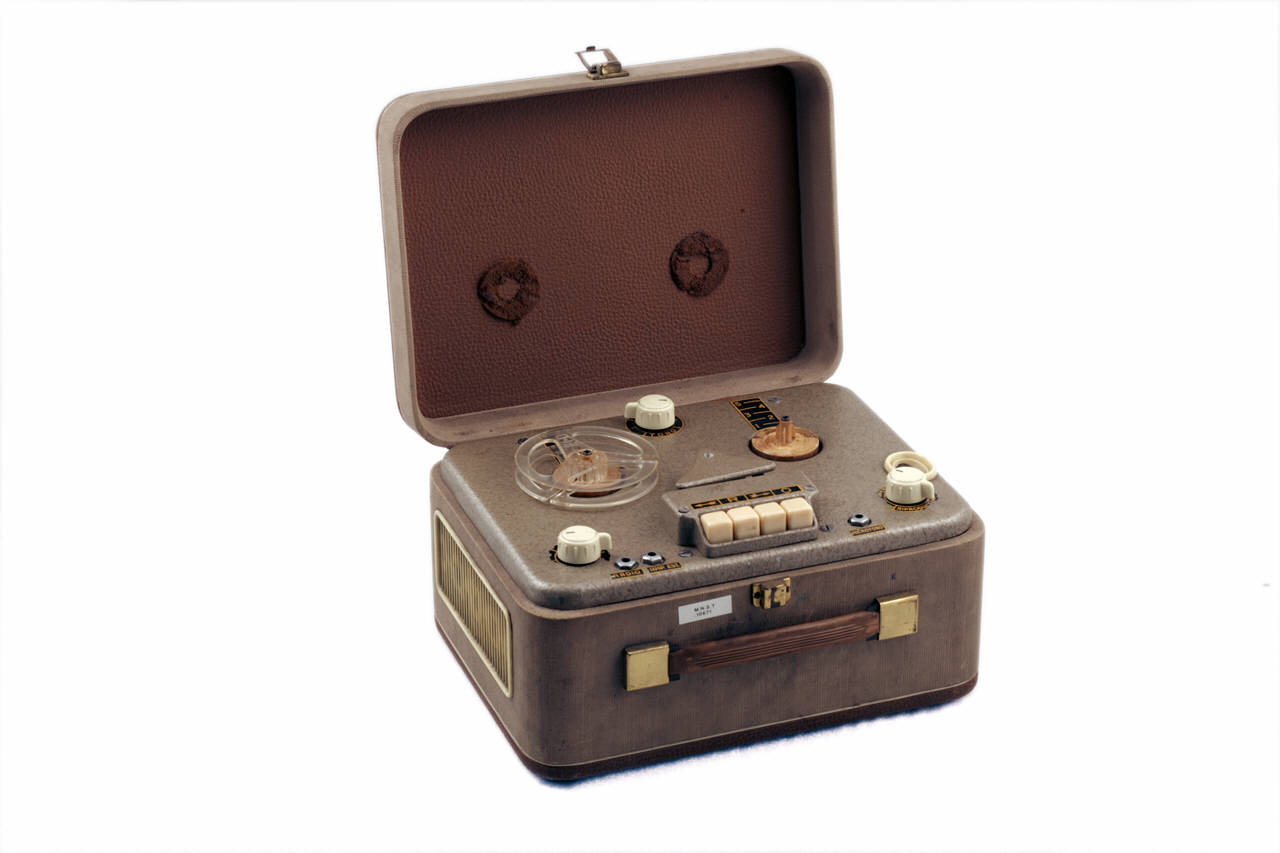 Magnetofono costituito da una scatola in legno, rivestito di tela cerata di colore beige nella fascia centrale e di colore marrone sul fondo e sul coperchio. Il coperchio apribile è fissato alla base con due cardini e chiudibile per mezzo di una serratura. La basa è provvista sul lato anteriore di una maniglia di gomma. La base contiene all'interno il motore e i circuiti elettrici per il funzionamento del magnetofono ed è chiusa da un piano superiore in metallo. Sul piano si trovano i fusi per la sistemazione delle bobine del nastro magnetico. Anche i comandi operativi dell'apparecchio sono posizionati sul piano superiore e consistono nelle tre manopole in bachelite bianca dei selettori dei livelli di tono e volume e del commutatore registrazione/riproduzione e nei quattro tasti in bachelite bianca per il riavvolgimento veloce, l'avvio della registrazione/riproduzione, l'avanzamento veloce e l'arresto del nastro magnetico. Le dotazioni del magnetofono comprendono inoltre tre boccole per il collegamento al microfono, all'amplificatore esterno e al radioricevitore. Sul lato posteriore è presente un commutatore per la selezione della tensione di alimentazione e un supporto bipolare. Sul fianco sinistro, una mascherina in bachelite bianca copre la membrana dell'altoparlante, mentre un'analoga mascherina sul fianco destro costituisce la presa d'aria per il raffreddamento dei circuiti. Un'altra presa d'aria si trova sul fondo dell'apparecchio, coperta da una lamina metallica traforata.