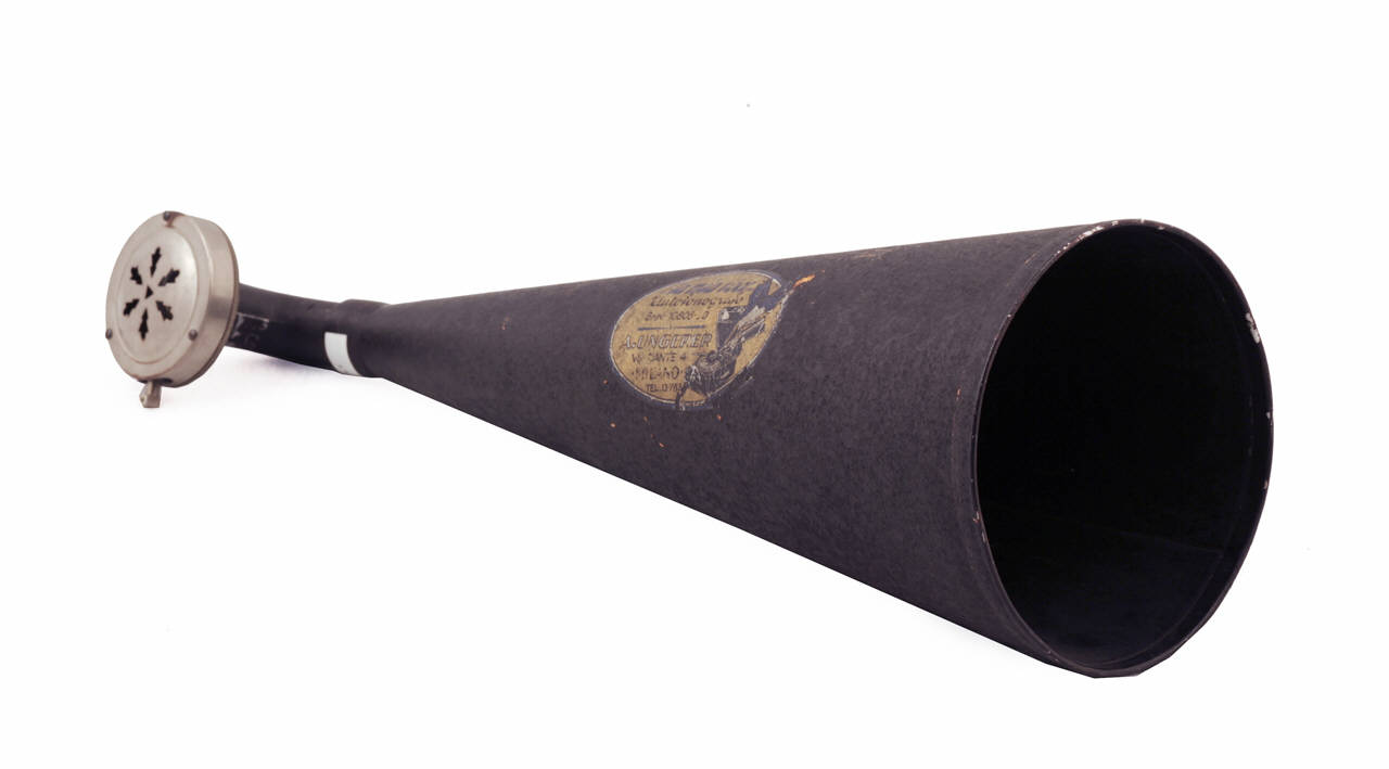 Tromba di forma conica con corpo in cartone nero e rinforzi in metallo alle estremità. La tromba è collegata mediante un tubo ricurvo in metallo ad un diaframma Thorens di manifattura svizzera.