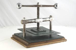 Torchio in ghisa, fissato su una base in legno e costituito da una pressa azionata da un sistema vite-madrevite. La traversa del torchio e il manubrio della vite sono cromati, mentre la platina e la base sono verniciate di verde scuro. Il copialettere è accessoriato con un registro copia fatture e con due pezze di tessuto spugnoso.