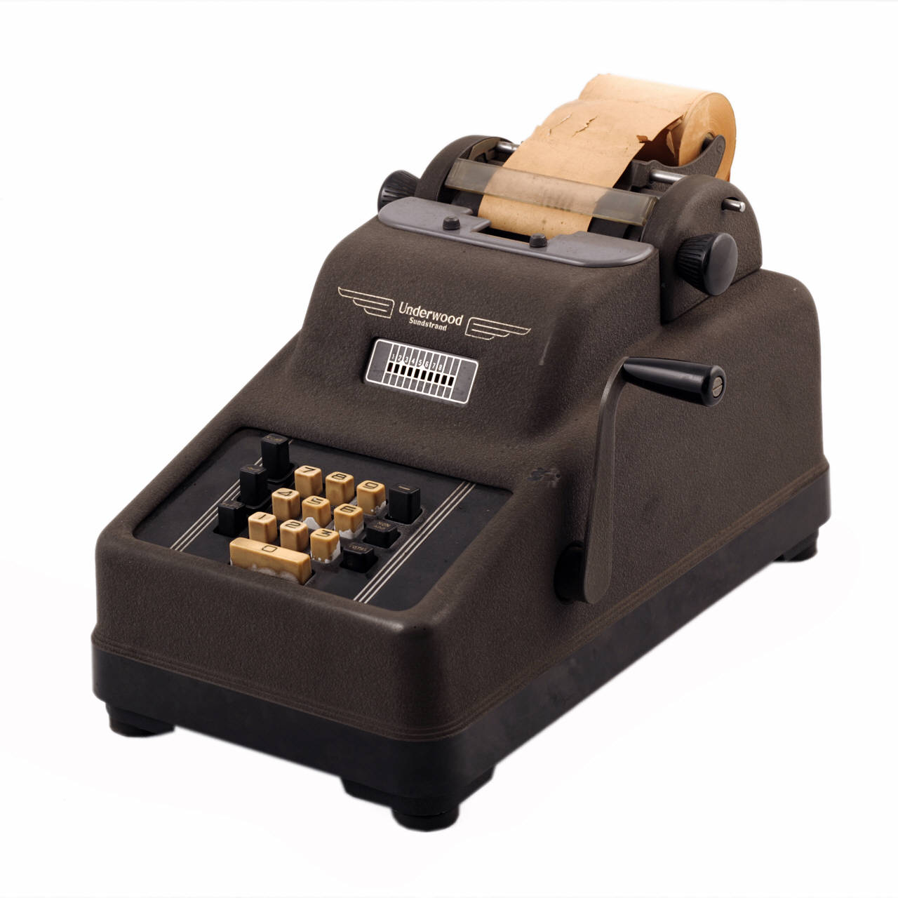 Addizionatrice con stampante, avente una base in metallo, verniciato di nero e una carrozzeria in bachelite zigrinata, di color antracite. La macchina è dotata di una tastiera ridotta, costituita da dieci tasti bianchi a sezione rettangolare, numerati da 0 a 9; sei tasti operativi di colore nero sono disposti ai due lati dei tasti numerici. Alla base della tastiera è inserito un pannello di colore nero. Alle spalle della tastiera si trova l'indicatore dell'unità decimale, costituito da dieci finestrelle, progressivamente chiuse da un'astina di colore rosso che si sposta ad ogni abbassamento di un tasto numerico. Il sistema di stampa è situato nella parte posteriore ed è costituito da nove blocchi di impressione per la stampa dei caratteri sul rotolo di carta; il supporto del rotolo di carta è collocato sul retro dell'addizionatrice. Il rullo rivestito di gomma è dotato di due manopole laterali in bachelite; le bobine di nastro inchiostratore sono nascoste da una mascherina in plastica grigia. Sul fianco destro dell'addizionatrice si trova la manovella, con impugnatura in bachelite, per l'esecuzione delle operazioni.