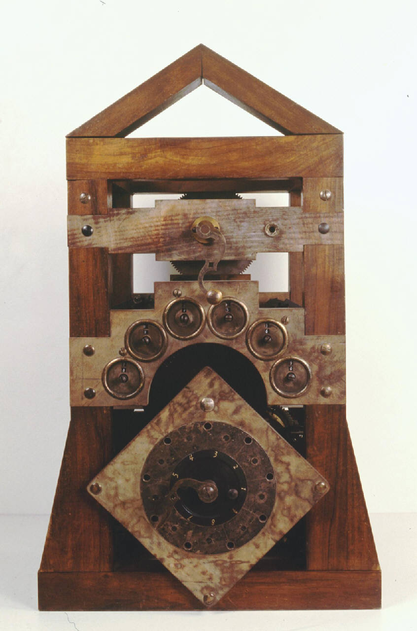 La macchina presenta un telaio aperto in legno, terminante sulla sommità con una cimasa. Il lato anteriore della macchina presenta una piastra quadrata fissata al telaio in modo tale che la diagonale del quadrato sia parallela alla base della macchina. Al centro della piastra è inserito un quadrante scanalato circolare, suddiviso in nove sezioni uguali, numerate da 1 a 9; in corrispondenza di ogni numero vi è un foro all'interno del quale è fa infilare il piolo che blocca il movimento della manovella posta al centro del quadrante. Al di sopra della piastra quadrata si trova il totalizzatore composto da sei quadranti circolari disposti ad arco, ognuno dei quali presenta due finestrelle per la visualizzazione del numeratore. Al di sopra del numeratore si trova un'altra manovella che comanda, attraverso le tre ruote dentate situate sul lato posteriore, lo spostamento degli ingranaggi per la selezione del numeratore nelle operazioni di moltiplicazione e divisione. L'elemento centrale della macchina è costituito dal traspositore a ruota con numero variabile di denti, ovvero una ruota i cui denti sono spostabili manualmente in modo tale da permettere la selezione della ruota dentata del numeratore da ingranare. Il funzionamento della macchina è azionato da un motore a peso, costituito da una corda, avvolta su un cilindro, alla quale è appeso un peso per mezzo di un sistema di pulegge.