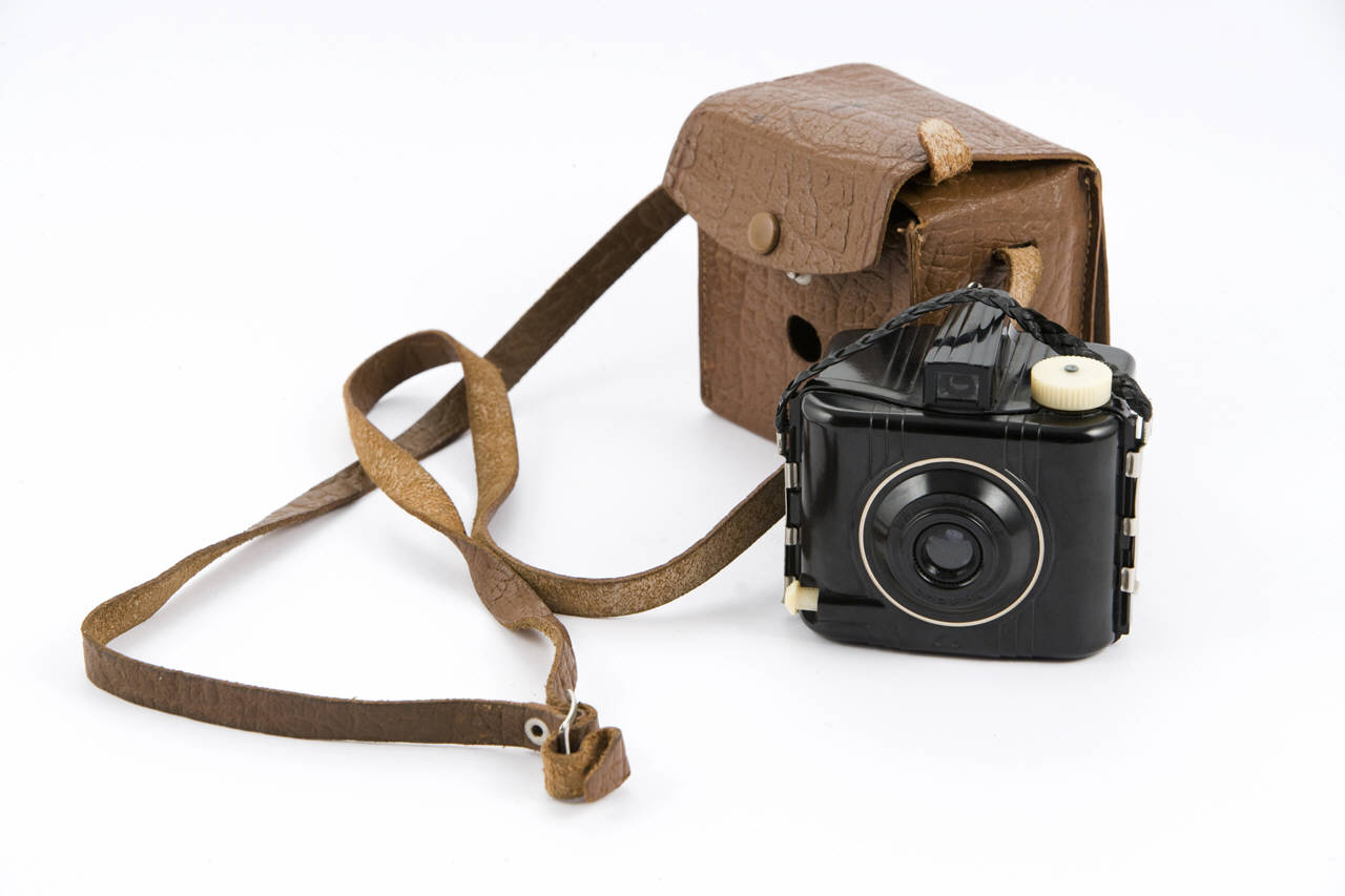 Apparecchio fotografico di forma cubica e di piccole dimensioni, realizzato in bachelite e con maniglia in pelle intrecciata.\nL'apparecchio è inserito in una custodia in cuoio marrone con tracolla e può essere utilizzato senza essere estratto dalla custodia.\nSuperiormente sono inseriti un mirino galileiano e la rotella in materiale plastico per l'avanzamento della pellicola.\nNella parete frontale è inserito l'obiettivo, costituito da una lente a menisco, a fuoco fisso e con otturatore a ghigliottina.\nIl pulsante di scatto è inserito lateralmente sotto all'obiettivo, in posizione frontale.\nSulla faccia posteriore è presente una finestrella trasparente rossa per la lettura del numero del fotogramma direttamente sul retro della pellicola posta all'interno.\nFacendo scorrere due dispositivi di sblocco laterali, è possibile aprire l'apparecchio per l'inserimento della pellicola in rullo da 127cm.\nAll'interno è visibile la zona trapezoidale in bachelite che funge da camera oscura.