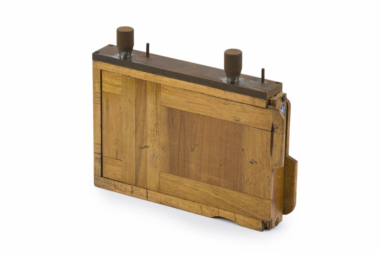 Questo porta lastre (per formati 13x18cm) ha forma parallelepipeda ed è costituito da un telaio in legno con due facce scorrevoli anch'esse in legno.\nAll'interno, da una parte è inserita una lastra in legno con maniglia in metallo che serviva per tenere posizionata la lastra fotografica, dall'altra è inserito un vetro ricoperto con un retino a sottili righe nere.\nSu uno dei lati lunghi del telaio sono inserite due viti che tengono in posizione il vetro interno. Queste viti sono mobili e i terminali hanno una scala graduata da 0 a 4 con tacche ogni 0,2.
