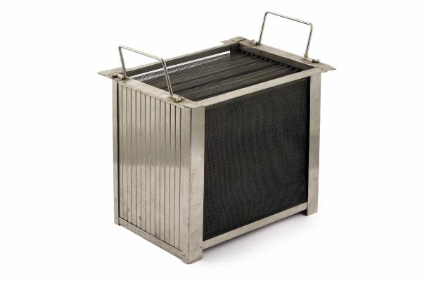Contenitore in metallo di forma parallelelpipeda con il lato superiore aperto.\nAll'interno sono inserite 16 retine rettangolari, parallele tra loro e posizionate in verticale.\nSul telaio superiore sono inserite due maniglie in metallo ripiegabili.