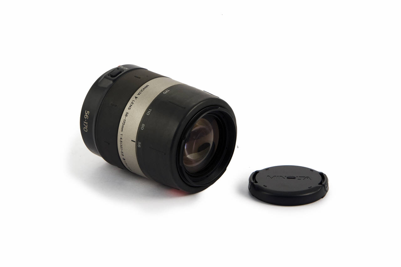 Obiettivo Minolta V-lens con zoom di lunghezza focale da 56 a 170mm e con apertura da 1:4.5 (f/32) a 5.6. Adatto per macro a distanze 1.2m/3.9ft.\nObiettivo in metallo ricoperto da materiale antiscivolo, di forma cilindrica e con attacco a baionetta.\nQuesto obiettivo è costituito da diversi cilindri coassiali liberi di scorrere l'uno sull'altro.\nAll'interno dell'obiettivo è inserito un diaframma a iride.\nMessa a fuoco, zoom e apertura del diaframma sono possibili direttamente ruotando parti dell'obiettivo che modificano la posizione dei cilindri che lo costituiscono o la posizione delle lamelle del diaframma.\nLe due estremità sono coperte e protette da due tappi rimovibili.