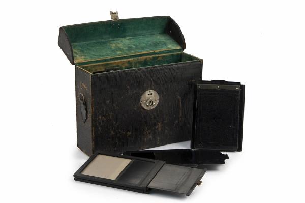 Valigia in cuoio ricoperta etsrenamente in pelle nera e internamente in velluto verde.\nSuperiormente è presente una maniglia in cuoio per il trasporto.\nLa parte superiore è apribile e fissata con una serratura in metallo.\nAll'interno la valigia è divisa in due scomparti ciascuno contenente porta lastre fotografici per formati 9x13.\nTre porta lastre sono doppi in metallo e materiale plastico e sono costituiti da un telaio in metallo con chiusura costituita da lastre scorrevoli.\nDue sono dello stesso tipo dei precedenti ma con telaio in legno.\nTre sono chassis singoli in metallo ricoperto in pelle con sportello in metallo.\nALtri tre, in metallo ricoperto in pelle, sono veri e propri dorsi da inserire sugli apparecchi fotografici.