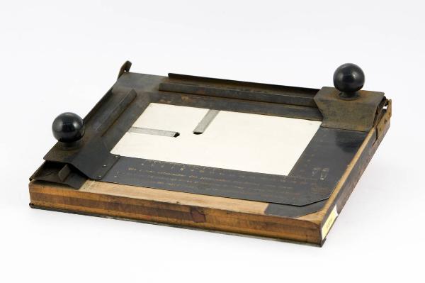 Su una base in legno con un rettangolo verniciato di bianco al centro è inserita una cornice in metallo incernierata nella parte superiore e sollevabile.\nQuesta cornice è costituita da due lati fissi sui quali sono inserite due guide. Nelle guide sono liberi di scorrere due alette costituite da due righelli in metallo comandati mediante due pomelli in bachelite. I righelli riportano indicazioni numeriche da 3 a 15cm (verticale) e da 4 a 21cm (orizzontale).\nNella finestra bianca sono inseriti due nonii con indicazioni numeriche da 0 a 40mm.