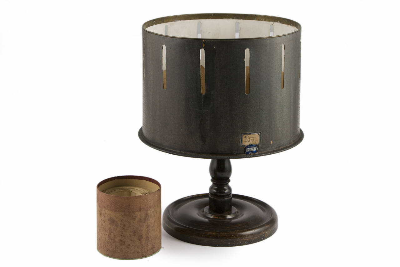 Su una base circolare in legno con stelo sagomato è inserito un cilindro aperto superiormente e chiuso inferiormente.\nIl cilindro può ruotare attorno al suo asse. Sulla superficie laterale, nella parte alta, sono praticate 12 fessure verticali a distanze regolari.\nAll'interno è inserita una striscia di carta con disegni di cerchi ed ovali.\nIn una scatoletta in cartoncino sono custodite altre strisce con disegni geometrici quali linee, punti, cerchi