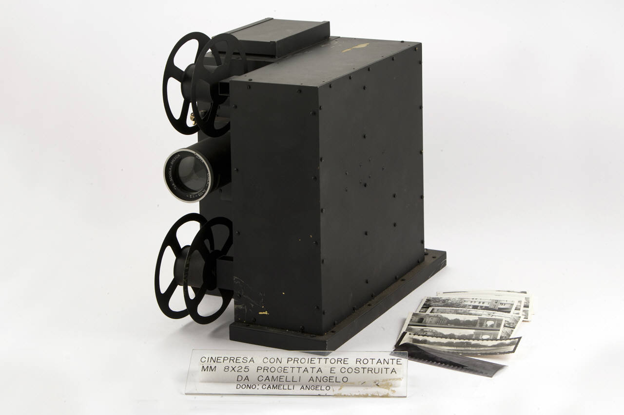 Proiettore di forma quasi cubica e aspetto molto spigoloso.\nNella parte sinistra è contenuto il motore elettrico, nella parte destra l'apparato illuminante anch'esso elettrico. Entrambi sono collegati al dispositivo di alimentazione mediante due boccole poste sul retro e sono attivati mediante due deviatori posti sempre sul retro.\nLa parte superiore dove è contenuto il dispositivo illuminante è fessurata per permettere il raffreddamento ma è disponibile un coperchio ad incastro.\nNella parte anteriore sono inserite due ??????in metallo sulle quali sono inserite due bobine in metallo, una per la pellicola non ancora proiettata e l'altra per quella già proiettata. Tra le due è inserito l'obiettivo La Scuola Super Lumen 1:2 f=105mm. L'obiettivo è incernierato sul lato esterno. Facendolo ruotare si vedono l'otturatore costituito da un disco in ottone, oscurato per metà da un foglio in plastica nera. Dietro all'otturatore si vede la guida dove passa la pellicola e la finestrella dove passa il fotogramma che viene illuminato e quindi proiettato (dimensioni del fotogramma 8x25mm).\nUna rotella posta lateralmente permette di far ruotare manualmente la bobina superiore.
