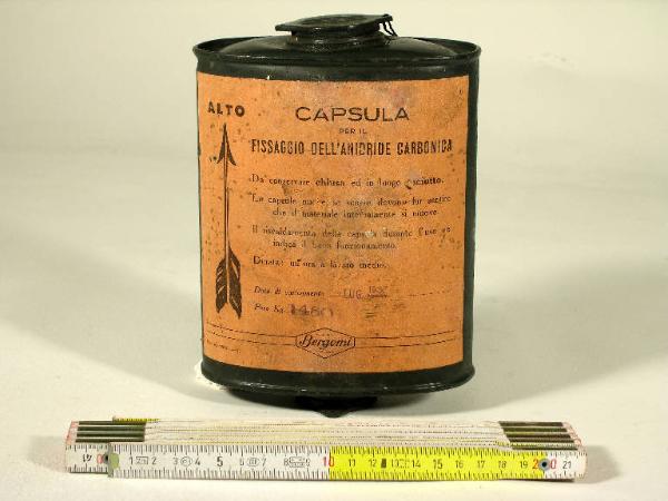 L'oggetto è costituito da un contenitore in lamina metallica a sezione ellittica, chiuso superiormente da un tappo ancora sigillato. All'interno del materiale solido incoerente. Un'etichetta in carta ricopre la metà della superficie: "Capsula per il fissaggio dell'anidride carbonica. Da conservare chiusa ed in luogo asciutto. Le capsule nuove, se scosse, devono far sentire che il materiale internamente si muove. Il riscaldamento della capsula durante l'uso ne indica il buon funzionamento. Durata: un'ora a lavoro medio. Data di caricamento: luglio 1937 - anno XV. Peso Kg: 1.460". L'oggetto è una componente dell'"autoprotettore modello SCM37", brevetto Spasciani (Milano): si tratta di un dispositivo di autoprotezione di uso militare, costituito da diverse parti: la capsula e una piccola bombola sono applicate su una piastra e collegate tra loro con giunzioni a tubi e rubinetti; la piastra si indossa sulle spalle come uno zaino; alla capsula si fissa un innesto (a vite) che si prolunga in un tubo terminante in una maschera facciale completa; un manometro, portato davanti, permette il controllo della pressione del dispositivo