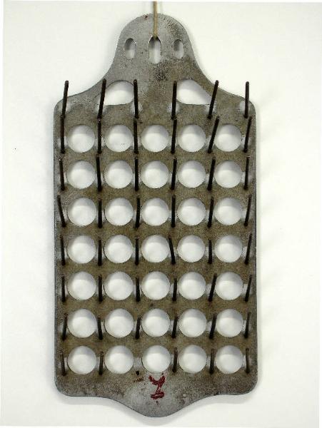 L'oggetto è realizzato a stampo e porta infissi dei perni in ferro (base x altezza, n°6x8), uno mancante nell'ultima fila in basso, per ospitare n°48 rocchetti da navetta