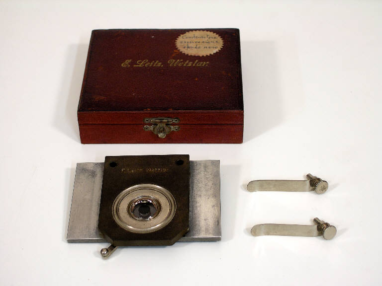 L'oggetto completo è formato da un tavolino portaoggetti per microscopio, con incorporato un condensatore, due linguette fermacampione e dalla scatola originale.