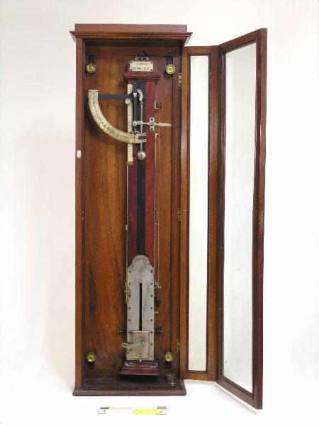 L'apparecchio si compone di un corpo di pompa, ripieno di olio incongelabile, il cui stantuffo è munito di una valvola manovrabile dall'esterno che regola la discesa dello stantuffo stesso, solidale con il carrello al quale è assicurato il capo inferiore del filo in esame. Una scala verticale graduata in millimetri serve per la determinazione dell'elasticità ed in essa le cifre segnano un percorso doppio di quello effettivo, cosicchè si ha direttamente l'allungamento percentuale e non quello riferito ai 50 cm di filo sui quali si opera; la graduazione va da 0 a 400. Il settore metallico a denti applicato alla parte superiore dell'apparecchio serve per la lettura della tenacità in grammi. L'indice indicatore della tenacità è mosso dalla discesa del serrafilo a cui è attaccato l'altro capo del filo; esso scorre per mezzo di un cricchetto doppio sui denti del settore metallico, arrestandosi subito al momento della rottura del filo contemporaneamente alla scala dell'elasticità: in tal modo con un'unica prova è possibile leggere entrambi i risultati. Una leva posta in alto a destra è collegata tramite una molla allo stantuffo e ne comanda la discesa. Lo strumento possiede una doppia graduazione in grammi: da 100 a 300 la prima, e da 0 a 150 la seconda. Lungo il fianco destro del serimetro corre un filo a piombo per la messa in bolla. Lo strumento è corredato da due pesini per il pretensionametno del filo da esaminare. Il serimetro è montato su di una cassetta a facce rettangolari in legno di rovere, e racchiuso in un armadietto a vetri con snodo completo delle antine che permette di operare senza togliere l'apparecchio dalla sua custodia. Piastra metallica in alto "Sistema brevettato"; incisione in basso: "Stagionatura Anonima - Milano - Via Moscova 33 - Serimetro Perfezionato"