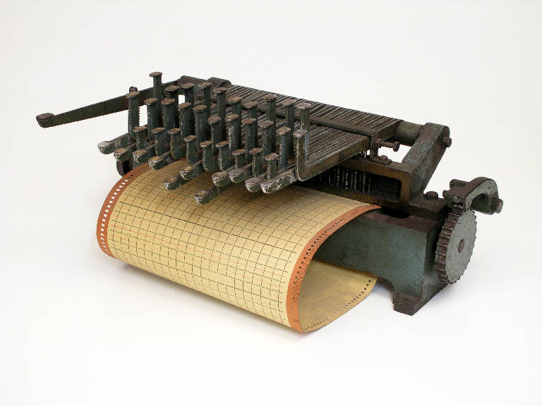 Lo strumento è una foratrice di carta continua per macchine ratière. Possiede n°32 tasti che realizzano la foratura per comandare fino a 64 licci. La macchina esegue la foratura di carta prodotta da "Schroers".