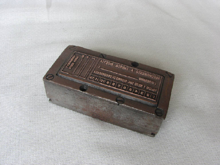 supporto in acciaio con viterie di montaggio su macchina stampatrice a forma di parallelepipedo con faccia superiore dotata di incastro a slitta con inserita matrice completa di abbonamento