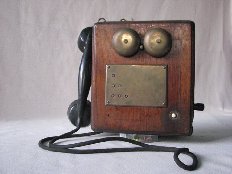 scatolato in legno con : sul lato destro manovella girevole ; sul lato sinistro gancio e relativa cornetta; sul davanti pulsante,suoneria a 2 campane e targhetta con indicazioni dei colpi di pulsante per comunicare con gli impianti limitrofi. All'interno circuiti elettrici ed un generatore di corrente azionato dalla manovella.