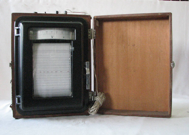 cassetta in legno con inserita una scatola metallica con superficie frontale in vetro sotto cui c'è un volmetro in alto e della carta righettata scorrevole con appoggiato una penna scivente.\nSulla superficie superiore due morsetti,un interruttore ed una presa di corrente