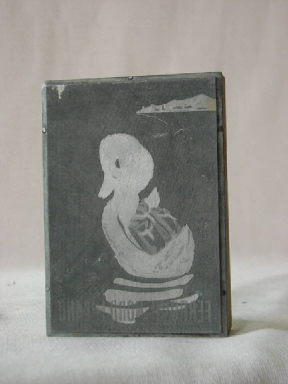 lastra per manifesto pubblicitario per posti di villeggiatura : Paperottola che nuota sul lago;gita sui laghi
