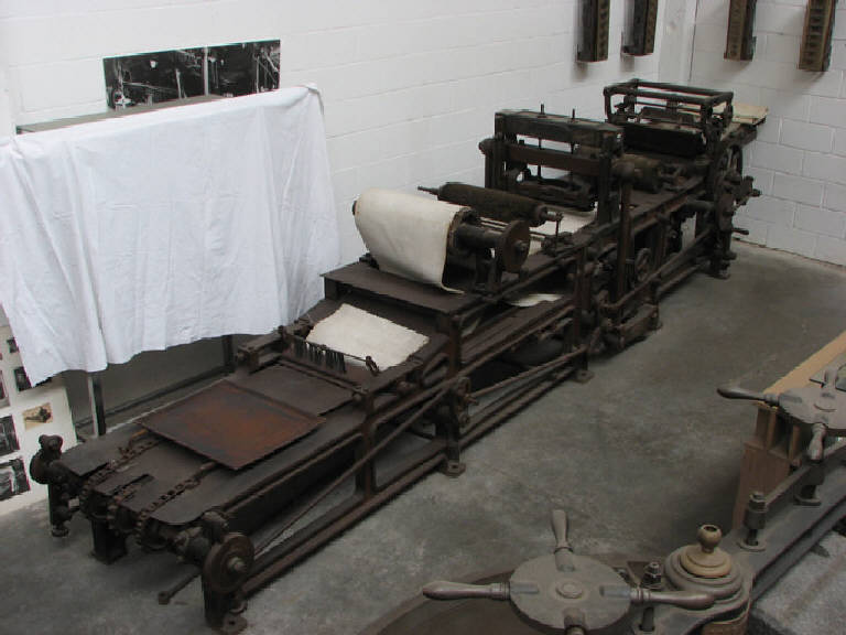 la macchina è composta da un telaio che si sviluppa notevolmente in senso longitudinale , che per facilitarne il trasporto e comunque per meglio movimentarla è smontabile in due parti pur mantenendo la continuità funzionale della parte superiore operativa. Tutta la movimentazione è alimentata da una trasmissione a cinghia centralizzata che si connette alla testata da cui iniziano le lavorazioni.Il movimento serve ad azionare le catene di trascinamento della tela in fibra naturale dove è posizionato l'impasto che ha già subito una prima laminazione. La macchina si compone di più apparecchiature montate in serie con la seguente sequenza : dopo il piano di appoggio sulla tela di trascinamento si incontra un primo traliccio a cavallo dove è installato un rullo di laminazione che dà lo spessore finale all'impasto; segue una spazzola a rullo in fibra naturale che gira a folle poggiandosi sull'impasto che avanza ,liberandolo da piccoli residui e dalla farina in maniera da lasciare la superficie superiore perfettamente liscia e pulita; si incontra quindi il traliccio su cui è montata la matrice di stampa e di taglio dei biscotti; quindi un'altra spazzola a rullo per l'eliminazione di piccole briciole.I biscotti tagliati proseguono sullo stesso piano finendo sui vassoi in lamiera che vengono trasferiti al forno.Gli sfridi di stampa dei lati e dell'impasto tra un biscotto e l'altro vengono manualmente sollevati su un rullo in legno posto sopra la tela e avvolti sullo stesso e riportati nella macchina di laminazione che precede la stampatrice.