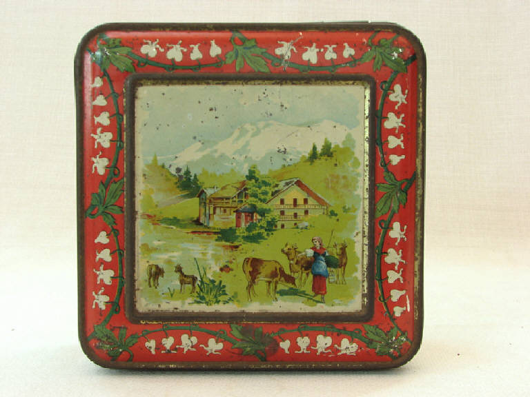 trattasi di una scatola metallica a forma quadrata, con coperchio , serigrafata con disegni vari su tutti i lati ad eccezione della base d'appoggio.Il motivo principale disegnato sul coperchio è rappresentato da una contadina con bovini al pascolo con sfondo una cascina e montagne.