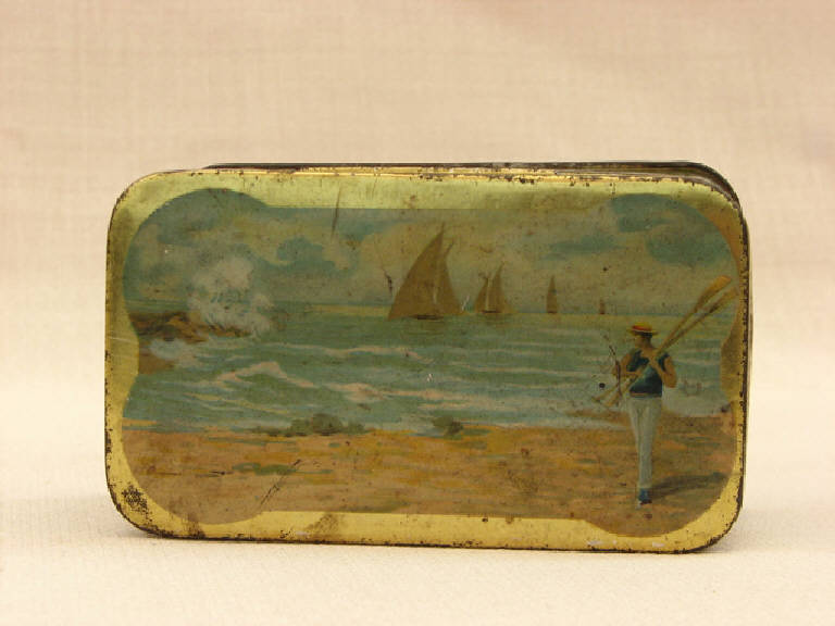 trattasi di una scatola metallica a forma di parallelepipedo, con coperchio , serigrafata con disegni vari su tutti i lati ad eccezione della base d'appoggio.Il motivo principale disegnato sul coperchio è rappresentato da scene di sport a vela e remi :sulle fiancate auto, tiro con fucile ,ciclo.