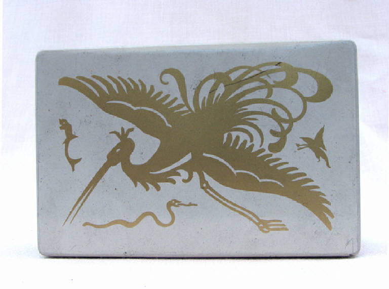 trattasi di una scatola metallica a forma di parallelepipedo, con coperchio , serigrafata con disegni vari su tutti i lati ad eccezione della base d'appoggio.Il motivo principale disegnato sul coperchio è rappresentato da un airone dorato su fondo bianco