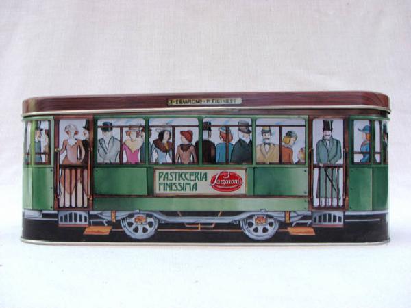 trattasi di una scatola metallica a forma di parallelepipedo, con coperchio , serigrafata con disegni vari su tutti i lati ad eccezione della base d'appoggio.Il motivo principale disegnato sul coperchio è rappresentato d tram di Milano n°3 Sempione-Porta Ticinese