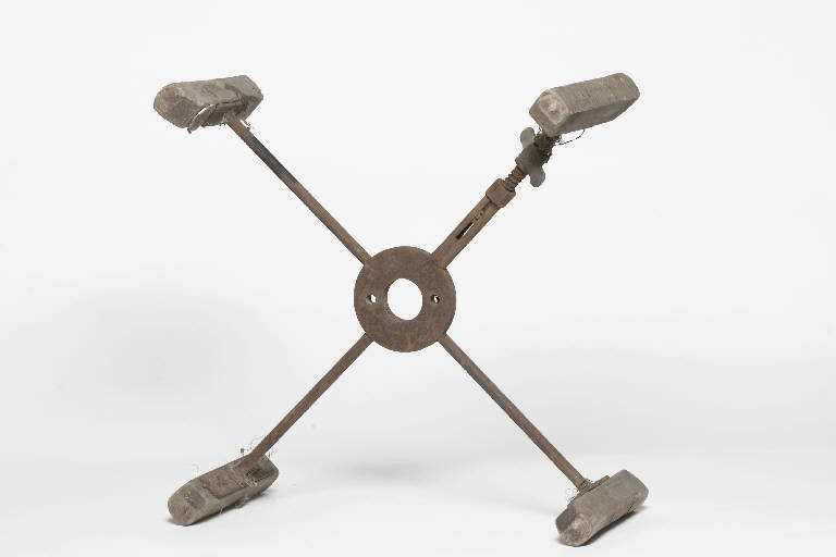 L'oggetto è un aspo a quattro appoggi con un braccio regolabile a vite. Appartiene ad una macchina di trattura per la trattura dei doppi