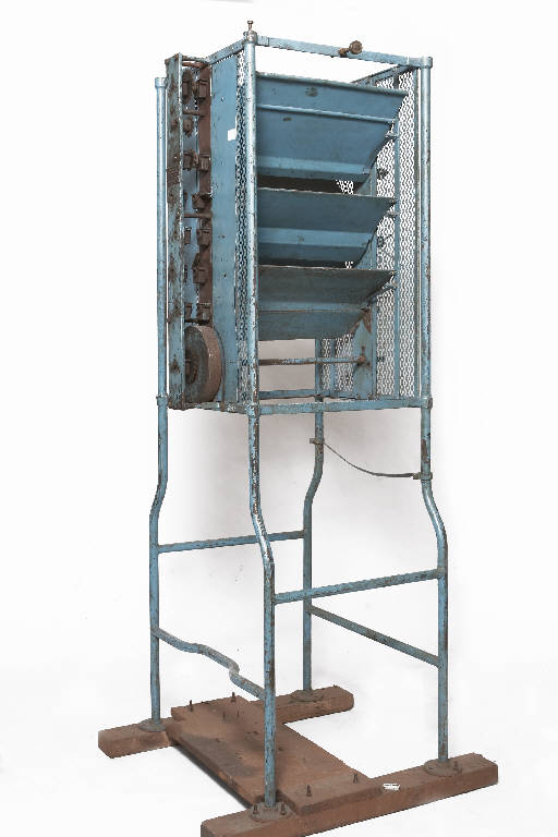 Lo strumento completo è formato da due parti. A: spelaiatrice a tramoggia: una tramoggia superiore con apertura regolabile, dalla quale discendono i bozzoli che si dirigono verso il basso guidati da successivi piani inclinati; all'estremità di ciascuno un fuso girevole ad alta velocità, con superficie rugosa, in cui si impigliano i fili della spelaia. B: tamburo rotante: un'elica interna spinge avanti i bozzoli, che trovano poi la via d'uscita attravesro le diverse sezioni del tamburo. Piastra fusa: "Brevetto Brambilla & Carini n°337 - Off. Mecc. G. Carini - MIlano via Savona 50"