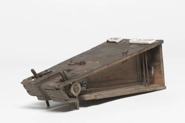 Cassetta di legno per binatrice, di forma trapezoidale, con meccanismo cascafilo in filo metallico. (Per binatrice simile a INVN: 00159)