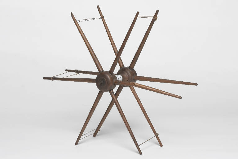 Aspino a 6 appoggi. L'oggetto è formato da una coppia di dischi centrali, brevemente distanziati da un perno, da ciascuno dei quali si dipartono 8 bacchette. Si ottiene in tal modo una struttura a coppie di raggi, legati fra loro alle estremità da un cordino, con funzione di appoggio della matassa. L'ampiezzaa dell'aspo è quindi regolabile regolando la posizione del cordino