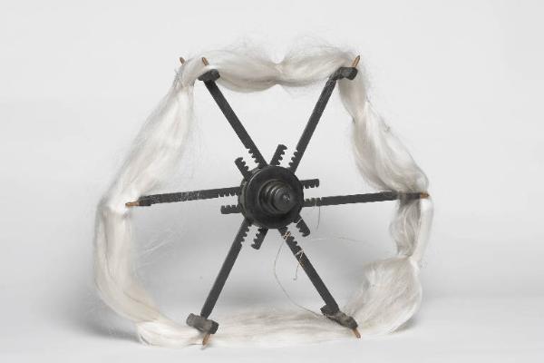 Aspino a 6 appoggi il legno verniciato nero. L'oggetto è formato da un corpo centrale che contiene due ruote dentate su cui ingrana la dentellatura dei raggi: ruotando le due metà destra e sinistra del corpo centrale, in direzioni opposte, si ottiene la regolazione della lunghezza dei 6 raggi contemporaneamente