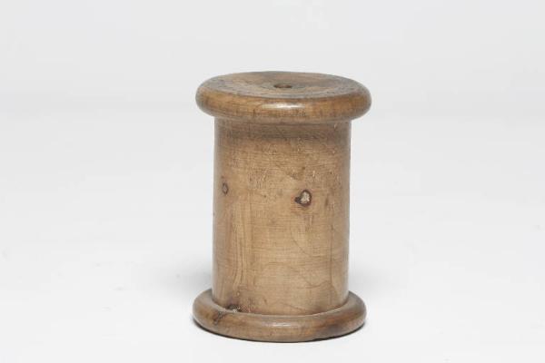Rocchetto interamente in legno, con anima molto grossa e piccole flange, realizzato per tornitura in un pezzo solo. Possiede un canale passante lungo l'asse, per il posizionamento sul fuso del filatoio.. I 19 oggetti della serie sono singolarmente contrassegnati con lettere da A a U